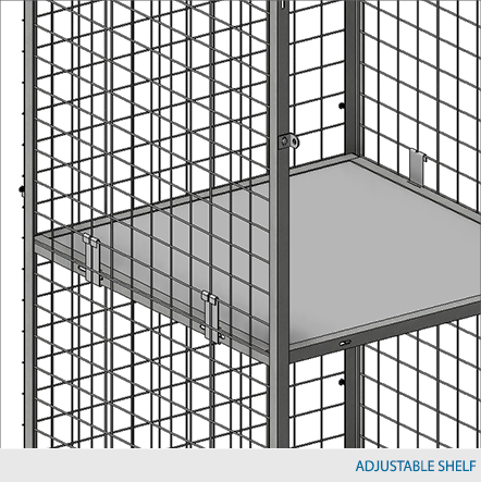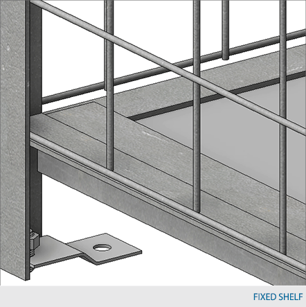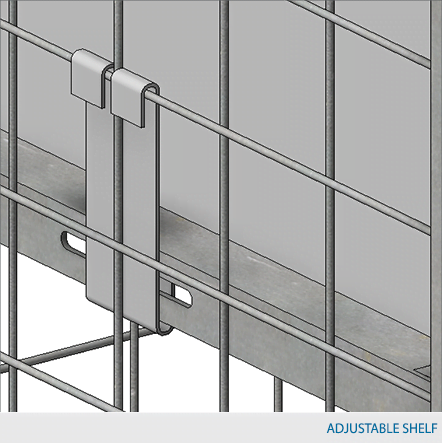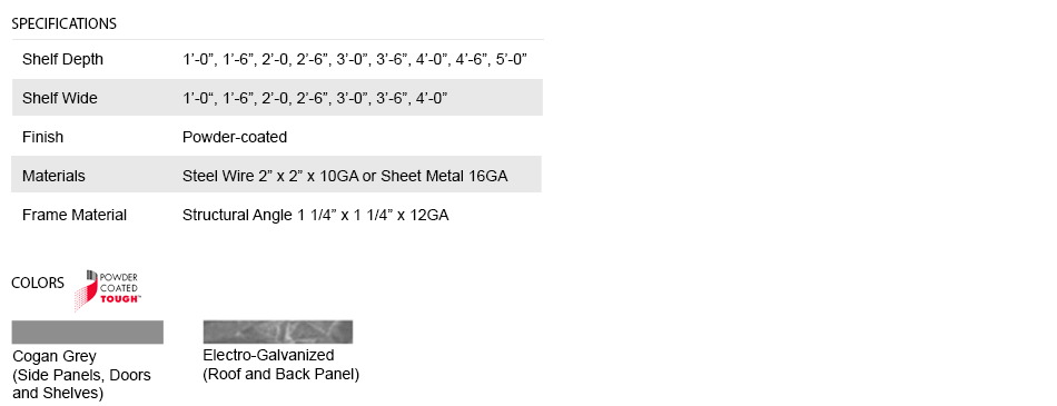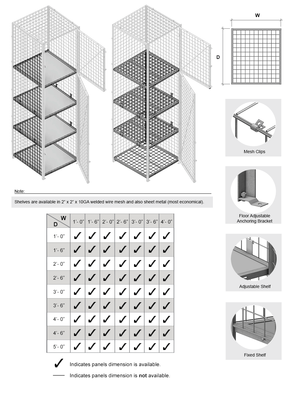 Dividing shelves are made of 2" x 2" x 10 GA welded wire mesh framed in 1 ¼" x 1 ¼" x12GA structural angle or with 16 GA sheet metal.