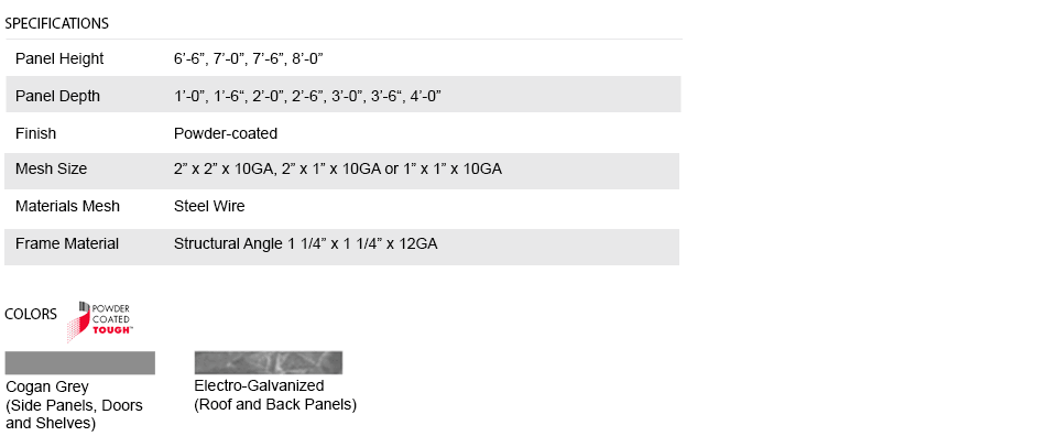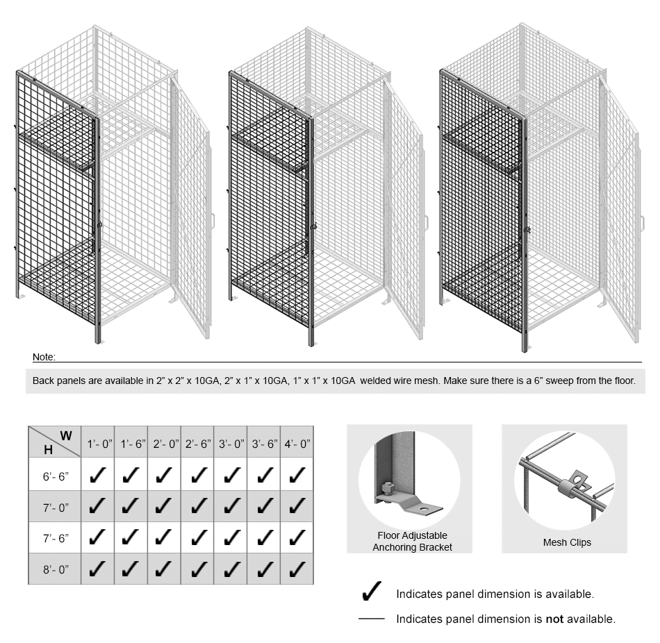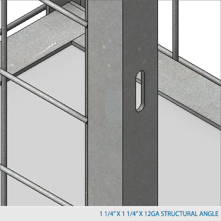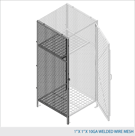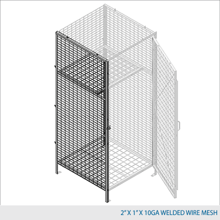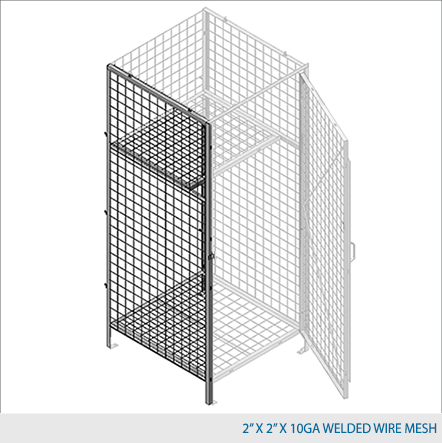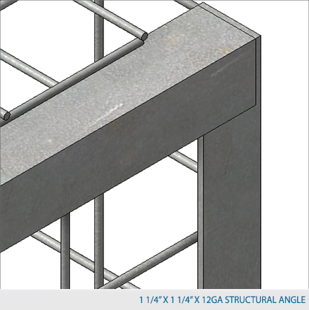 Side panels are made of framed 2" x 2" x 10 GA, 2" x 1" x 10 GA or 1" x 1" x 10 GA welded wire mesh with 1 ¼" x 1 ¼" x12GA structural angle.