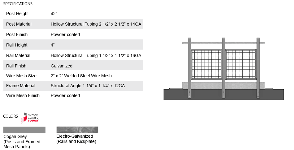 Cogan wire mesh handrails are our upgraded system designed to meet the stringent safety requirements of mezzanines intended for public use. Panels are made of 2"x2" welded wire mesh and are shop welded to 1 1/4"x1 1/4" structural steel frames. Handrail posts are made of 2 1/2"x2 1/2" steel tube. Rails are made of 1 1/2"x1 1/2" steel tube and simply fasten to the posts using specially designed zinc-plated clips. This allows for the rails to be cut to size and attached without welding, reducing installation time and cost. Kick plate is also available.