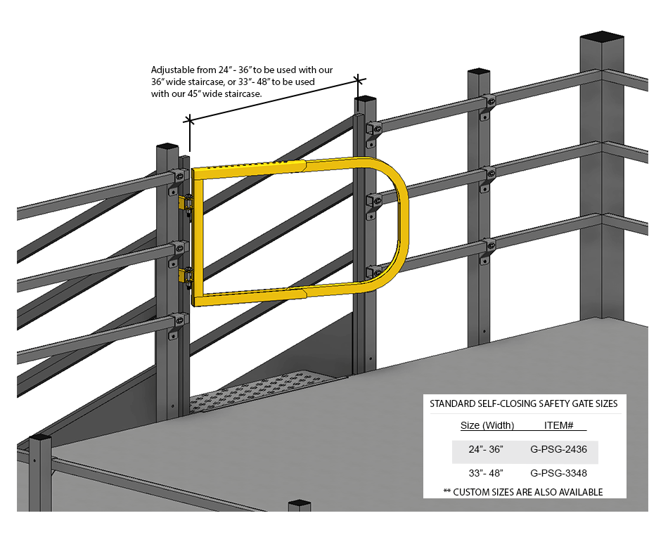 All self-closing safety gates are sealed in a durable, powder-coated safety yellow paint finish for maximum visibility.