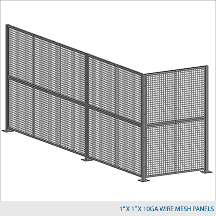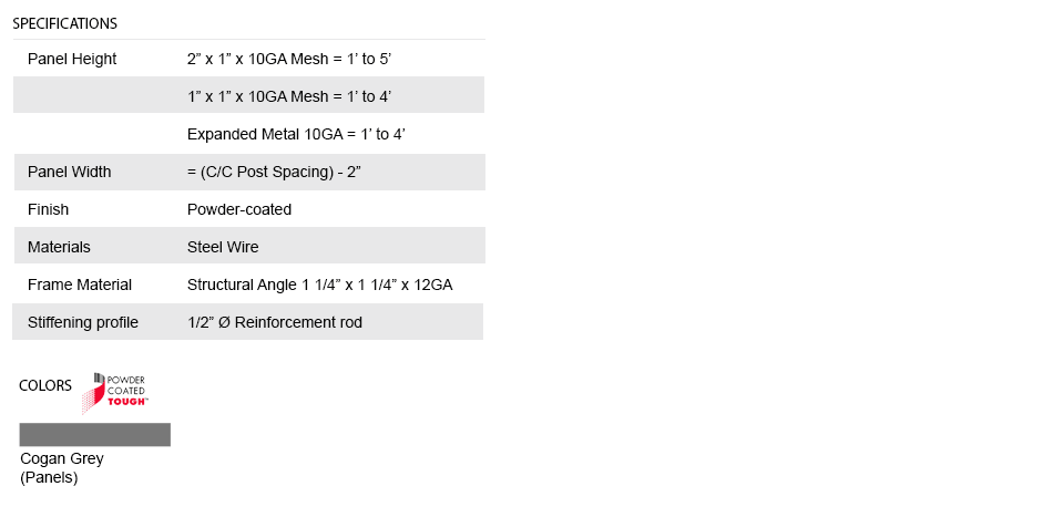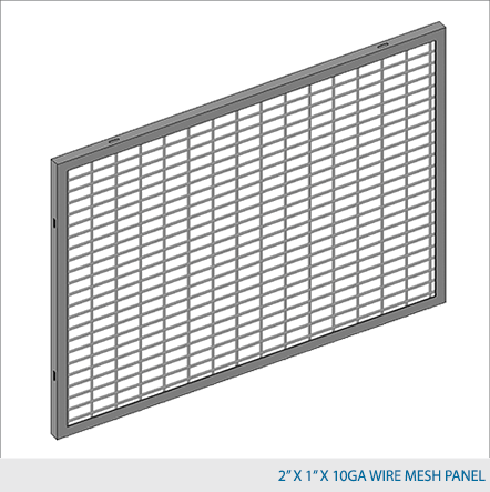 Panels are made of 2" x 1" x 10 GA welded wire mesh or 1" x 1" x 10 GA welded wire mesh or expanded metal that is framed in 1 1/4" x 1 1/4" x 12 GA structural angle with one or two welded 1/2" ø reinforcement rods.