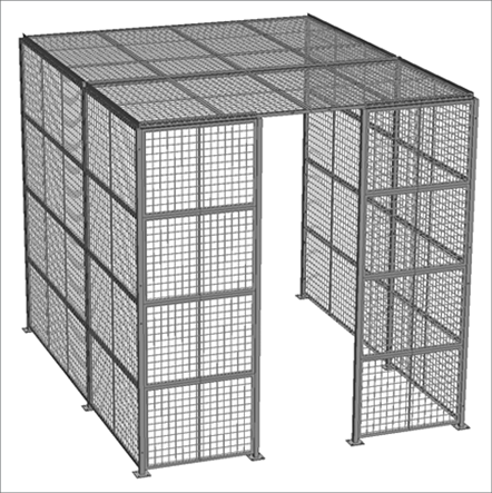 This partition system features freestanding posts up to 42' high and includes framed roof panels for added security. Standard post spacing is 2' to 10' center-to-center. Custom post spacing is also available. The perfect system when you need a high-level security partition in your plant or warehouse. Panels are made of 2" x 1" x 10 GA welded wire mesh framed in 1 1/4" x 1 1/4" x 12GA structural angle with one or two welded 1/2"ø reinforcement rods.