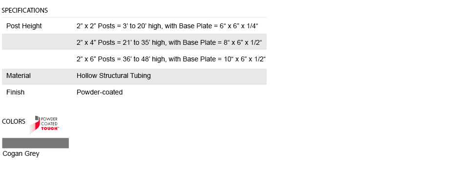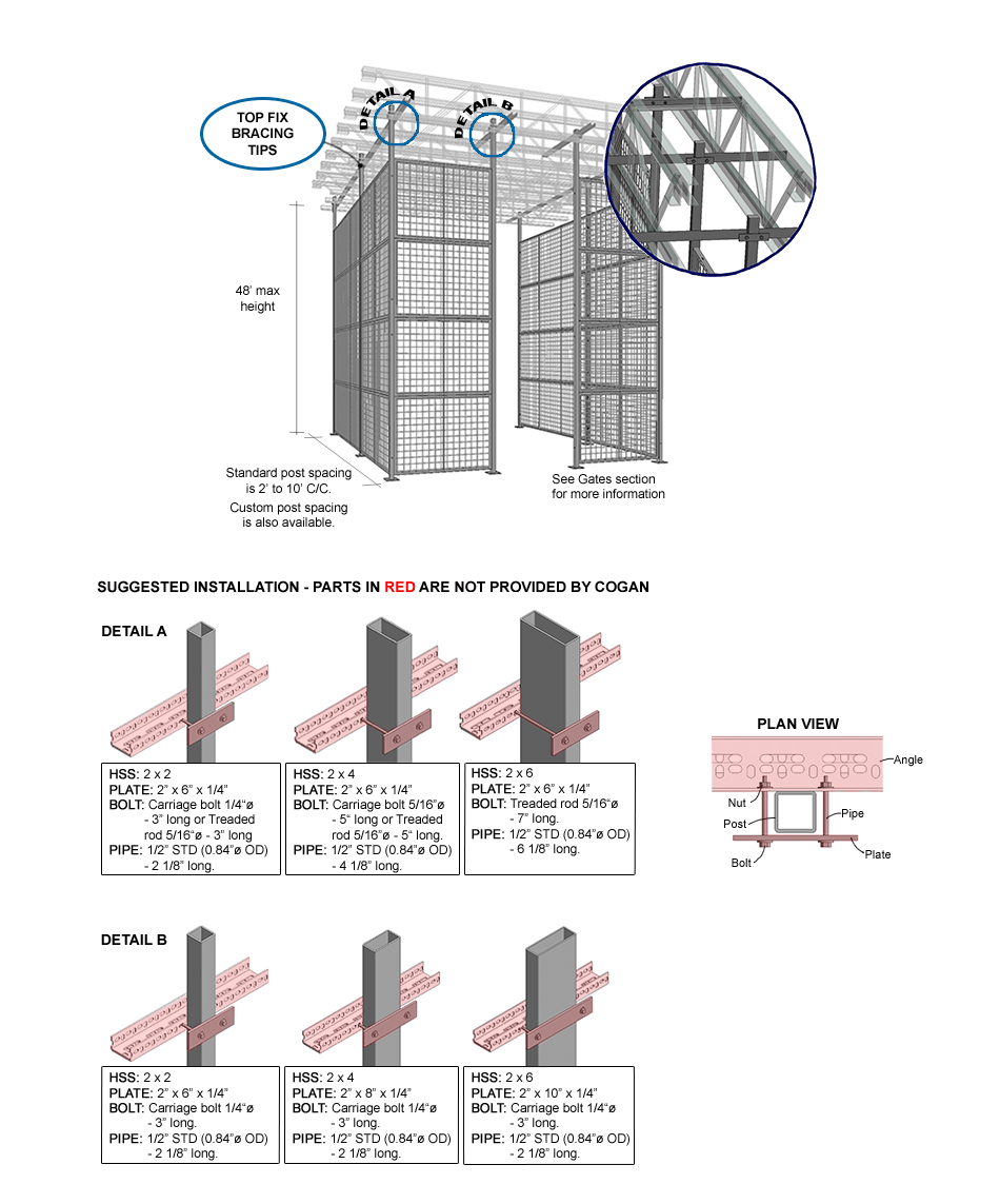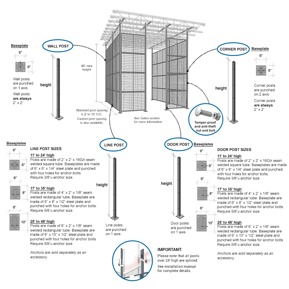 This partition system features floor-to-ceiling posts up to 48' high. Standard post spacing is 2' to 10' center-to-center. Custom post spacing is also available. Ideal for maximizing storage or workspace as the partition utilizes the full height of your facility. Panels are made of 2" x 1" x 10 GA welded wire mesh framed in 1 1/4" x 1 1/4" x 12GA structural angle with one or two welded ø 1/2" ø reinforcement rods.
