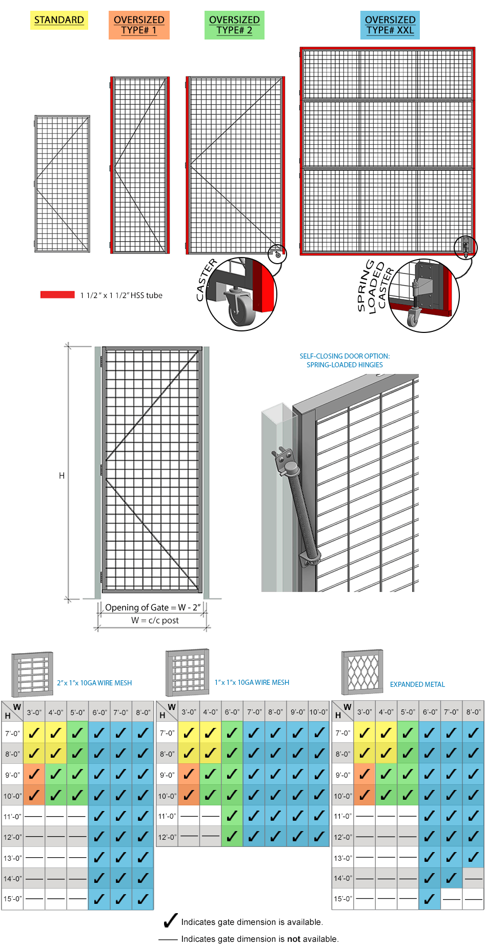 Please consult the table below for a complete list of dimensions. Important: All standard swing gates for DEA storage are self-closing. Oversized swing gates are not self-closing.