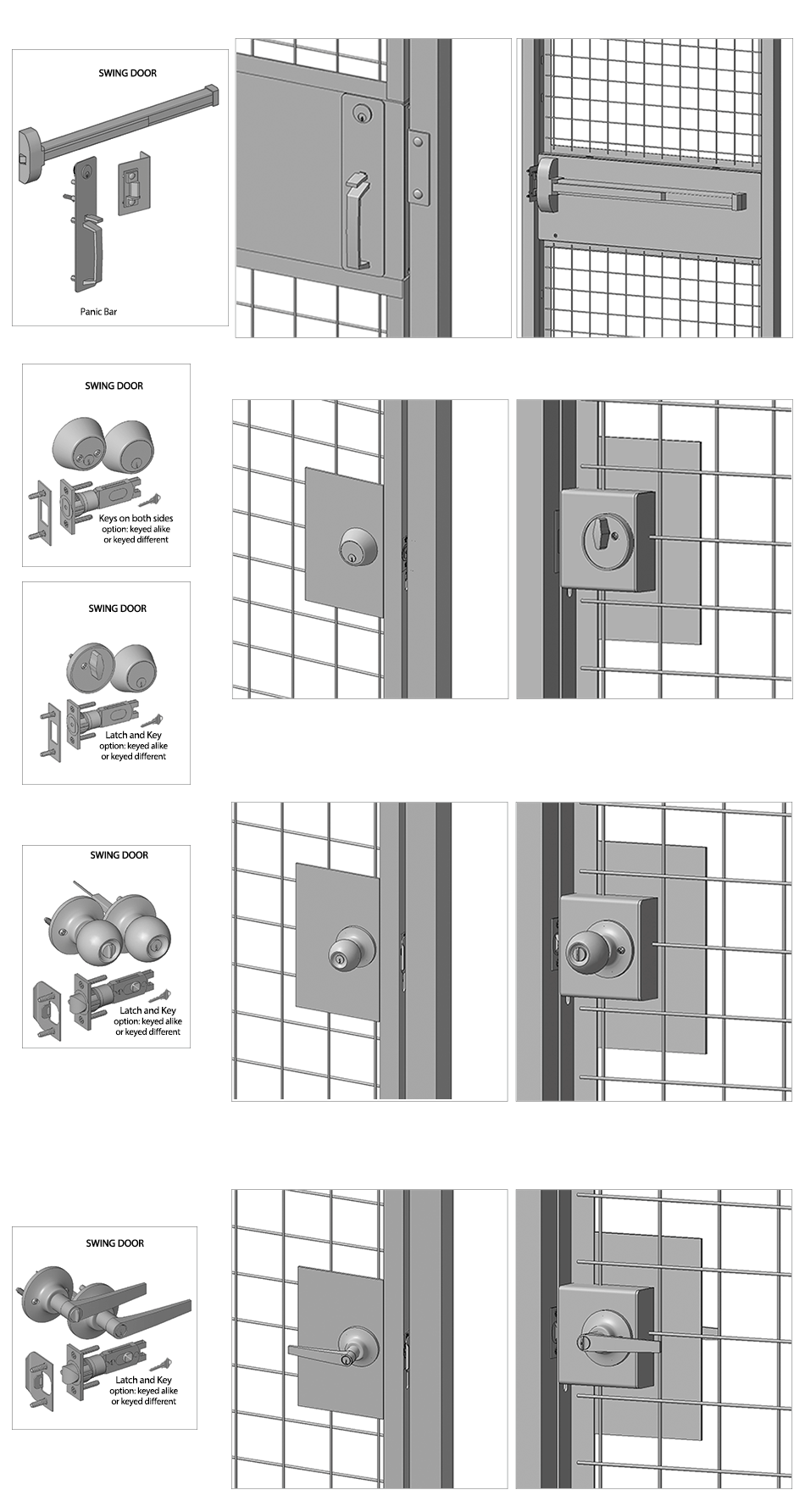 Below are the standard cylinder lock options for all of our partition security gates. Choose between a latch and key, or keys on both sides for added security. Panic bars are also available for swing gates.