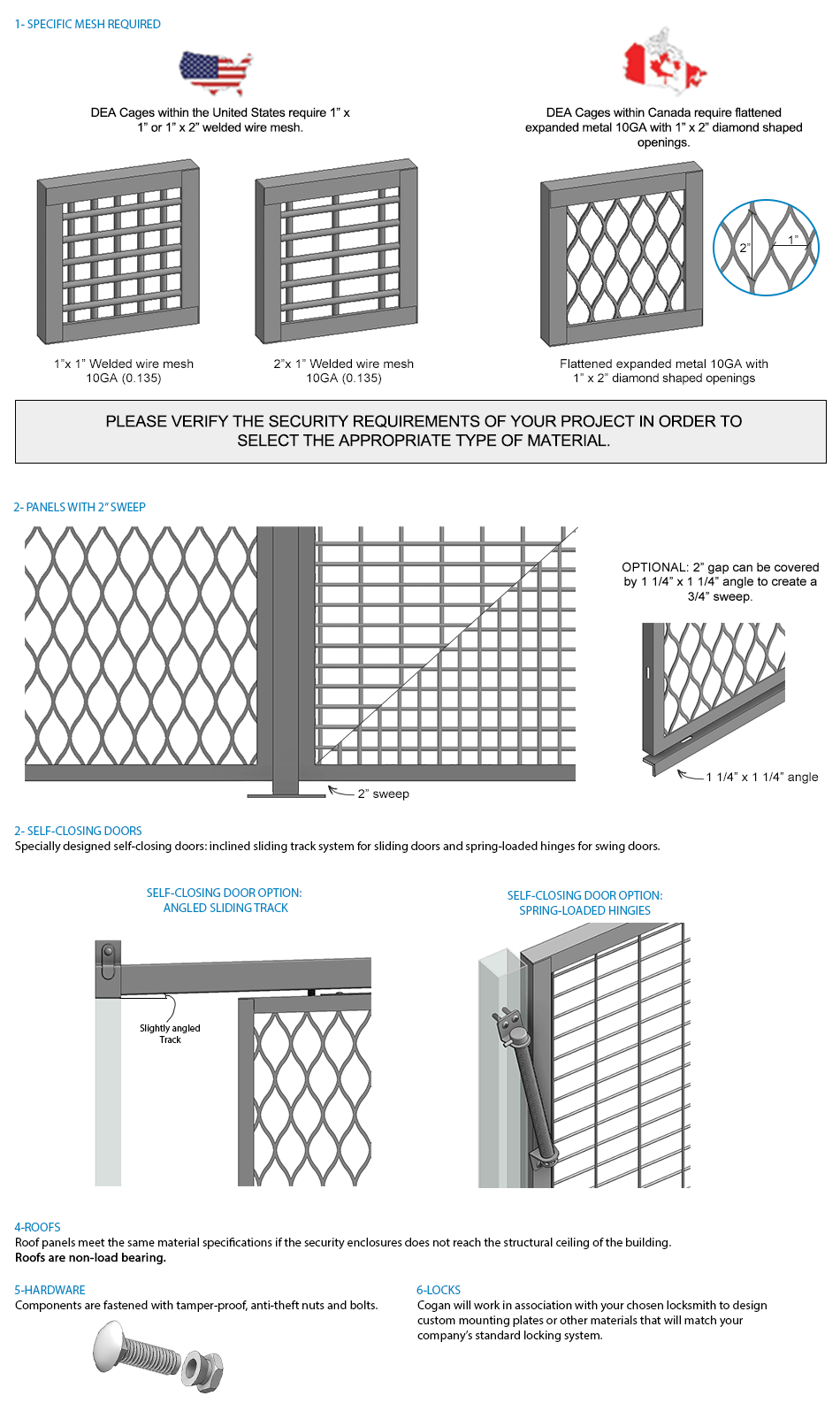 Cogan DEA cages meet both the US Drug Enforcement Administration's requirements for physical security of Schedule III through IV controlled substances as stipulated in Title 21 CFR Sections 1301:72-1301.76 physical security controls, and the Health Canada Directive on Physical Security Requirements for Controlled Substances. Below are the details that differentiate from standard Cogan Safegard partitions.