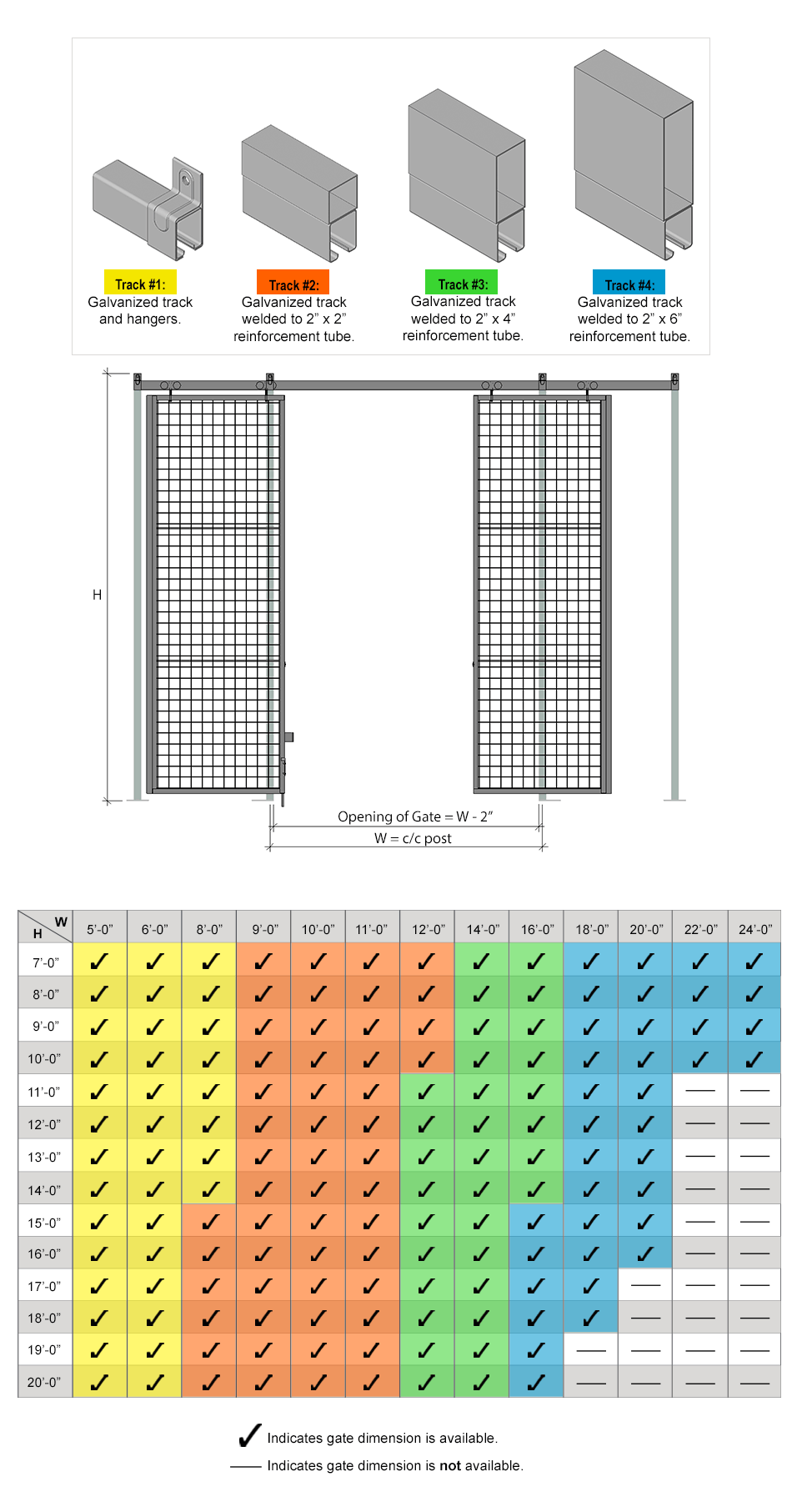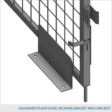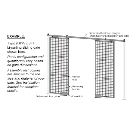 Cogan bi-parting sliding gates are available in a similar range of convenient sizes as our sliding gates. Ideal for use in constricted areas. All bi-parting sliding gates are equipped with a padlock hasp. Additional lock options are also available. Doors are made of 2" x 2" x 10 GA welded wire mesh framed in 1 1/4" x 1 1/4" x 12GA structural angle with two welded 1/2" ø reinforcement.