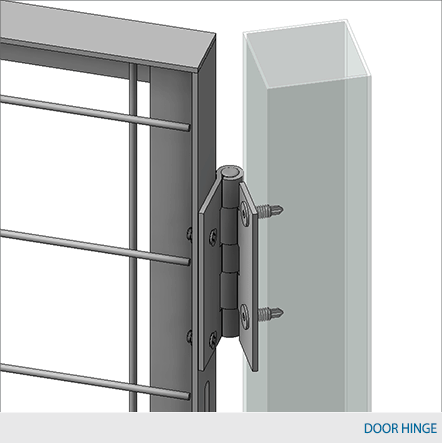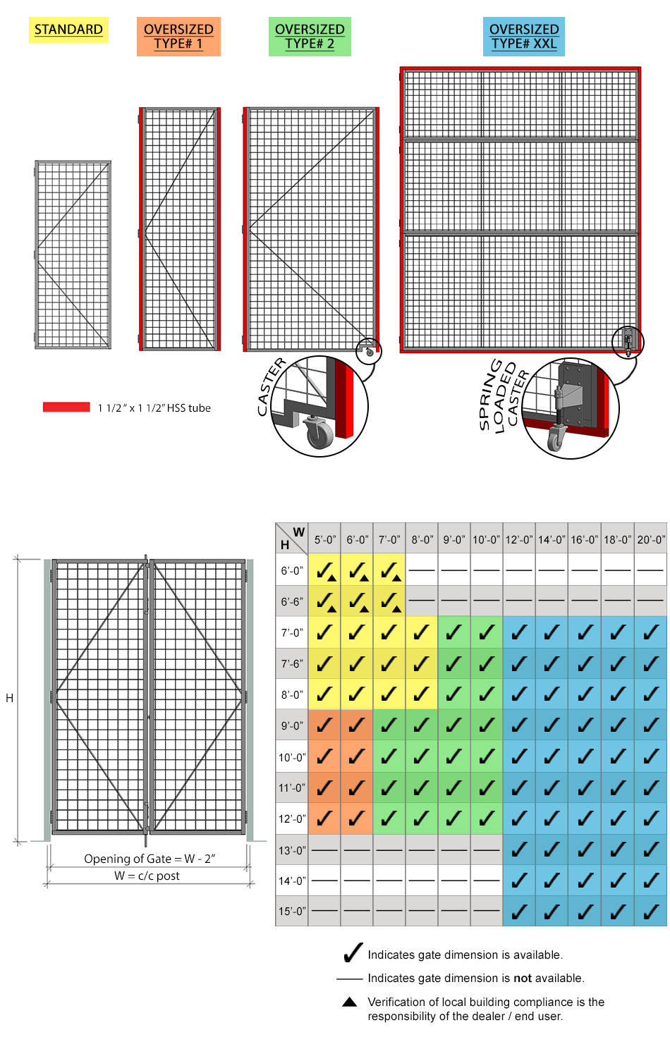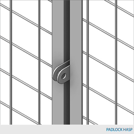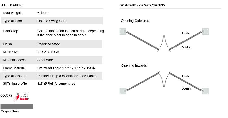 All double swing gates are equipped with a padlock hasp, hinges and door stoppers. Gates can be installed in two different orientations (open inwards or outwards). Additional lock options are also available. Doors are made of 2" x 2" x 10 GA welded wire mesh framed in 1 1/4" x 1 1/4" x 12GA structural angle with two welded 1/2"ø reinforcement rods from center to the corner.