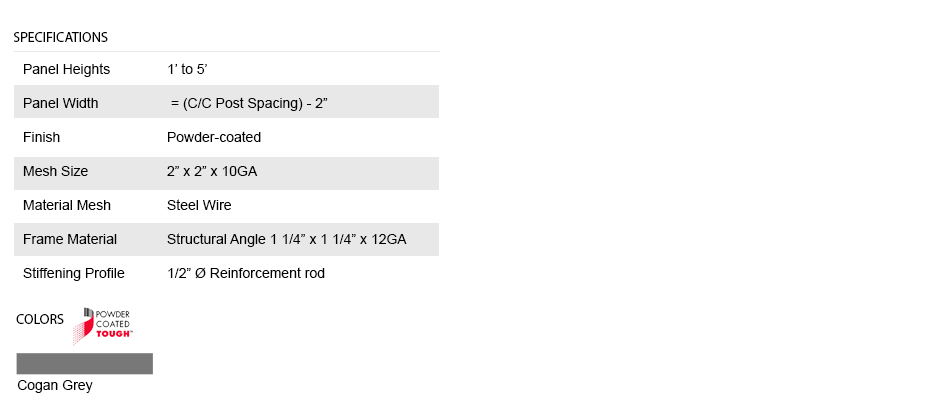 Panels are made of 2" x 2" x 10 GA welded wire mesh framed in 1 1/4" x 1 1/4" x 12GA structural angle with one or two welded 1/2"ø reinforcement rods.
