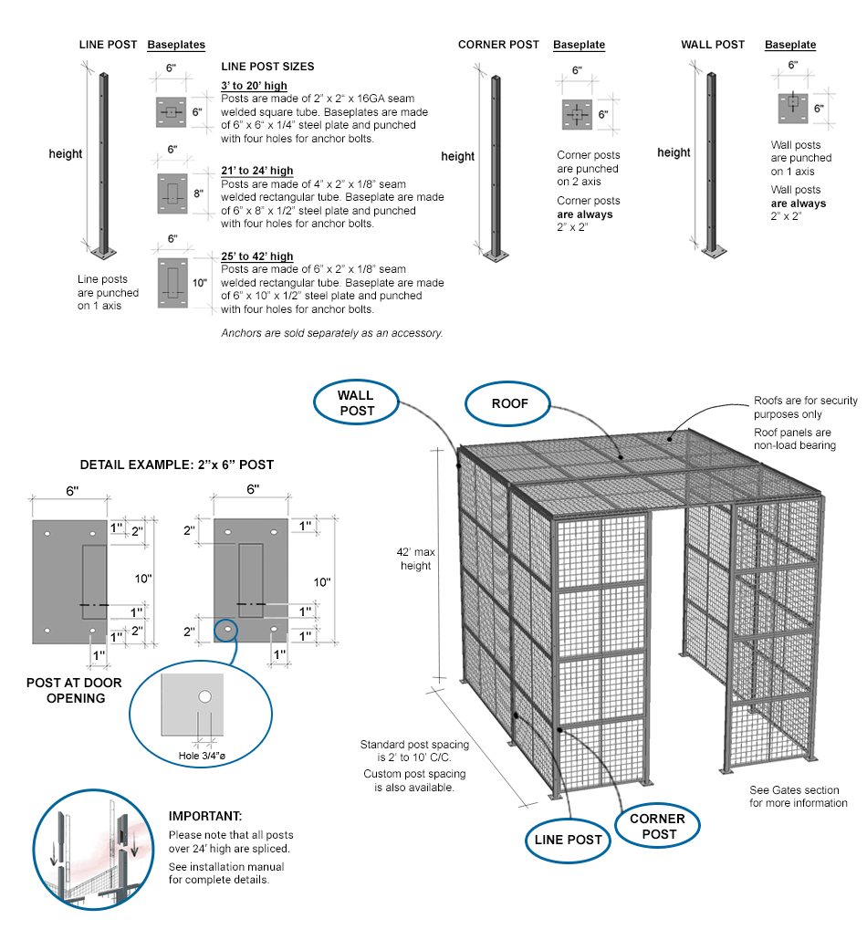 This partition system features freestanding posts up to 42' high and includes framed roof panels for added security. Standard post spacing is 2' to 10' center-to-center. Custom post spacing is also available. The perfect system when you need a high-level security partition in your plant or warehouse. Panels are made of 2" x 2" x 10 GA welded wire mesh framed in 1 1/4" x 1 1/4" x 12GA structural angle with one or two welded 1/2"ø reinforcement rods.