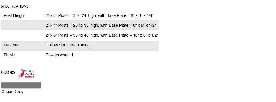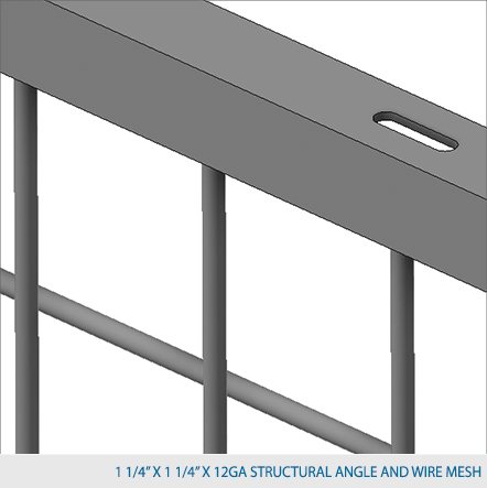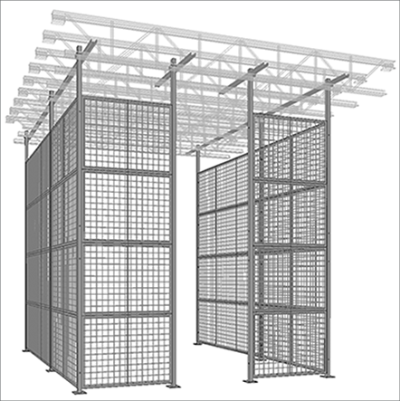 This partition system features floor-to-ceiling posts up to 48' high. Standard post spacing is 2' to 10' center-to-center. Custom post spacing is also available. Ideal for maximizing storage or workspace as the partition utilizes the full height of your facility. Panels are made of 2" x 2" x 10 GA welded wire mesh framed in 1 1/4" x 1 1/4" x 12GA structural angle with one or two welded ø 1/2" ø reinforcement rods.