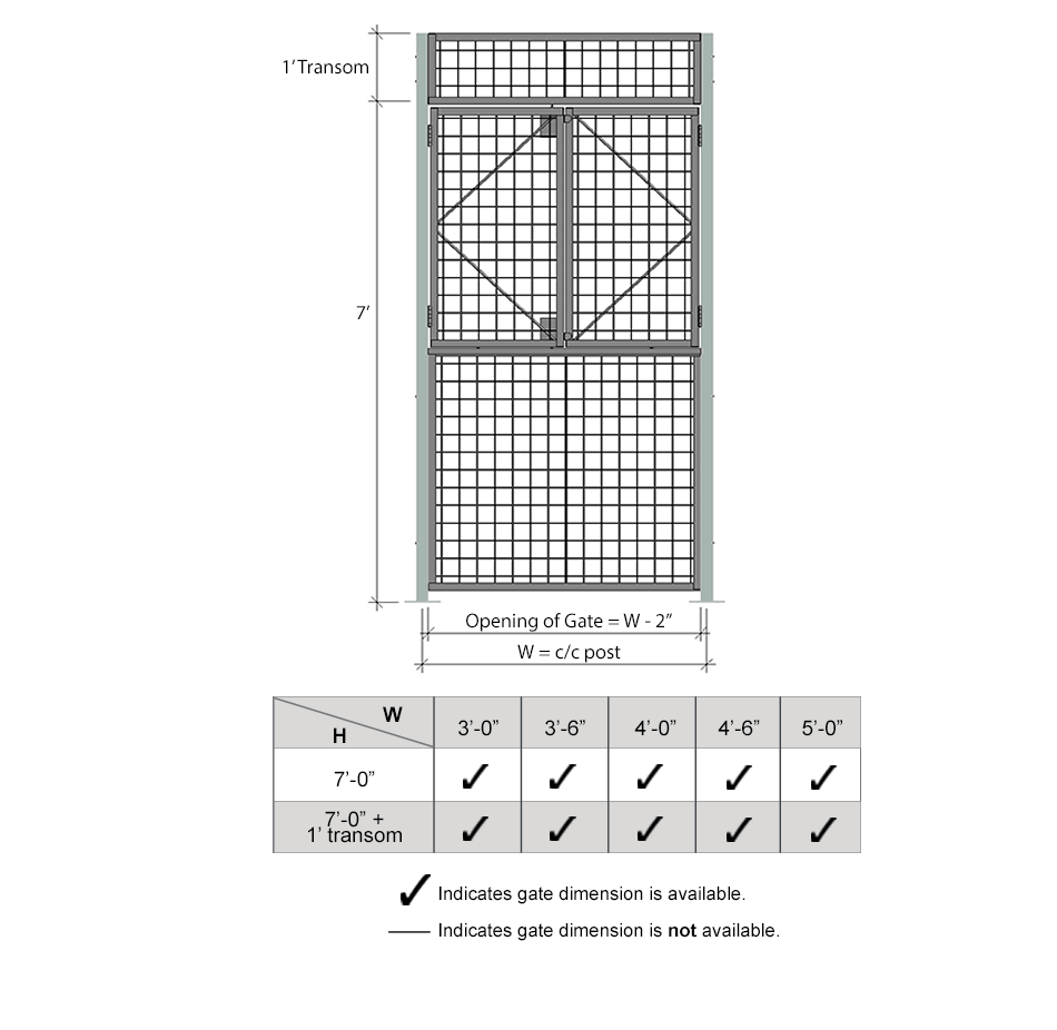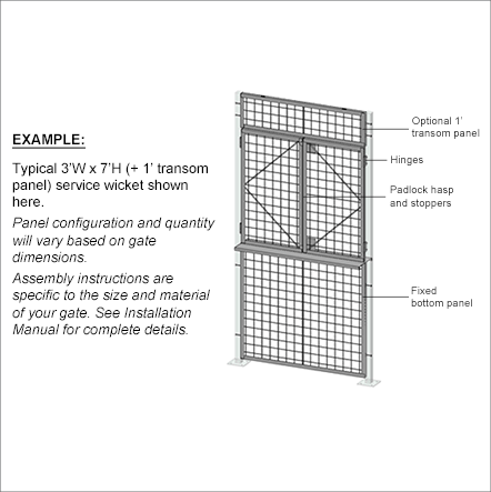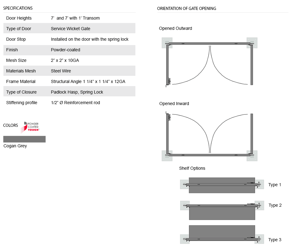 Cogan's service wicket gate acts as a service counter. The top portion of the door swings open, while the bottom portion remains fixed to restrict free access to the partition. All service wicket gates are equipped with a padlock hasp, hinges and door stoppers. Additional lock options are also available.Doors are made of 2" x 2" x 10 GA welded wire mesh framed in 1 1/4" x 1 1/4" x 12GA structural angle with two welded 1/2" ø reinforcement rods from center to the corner.