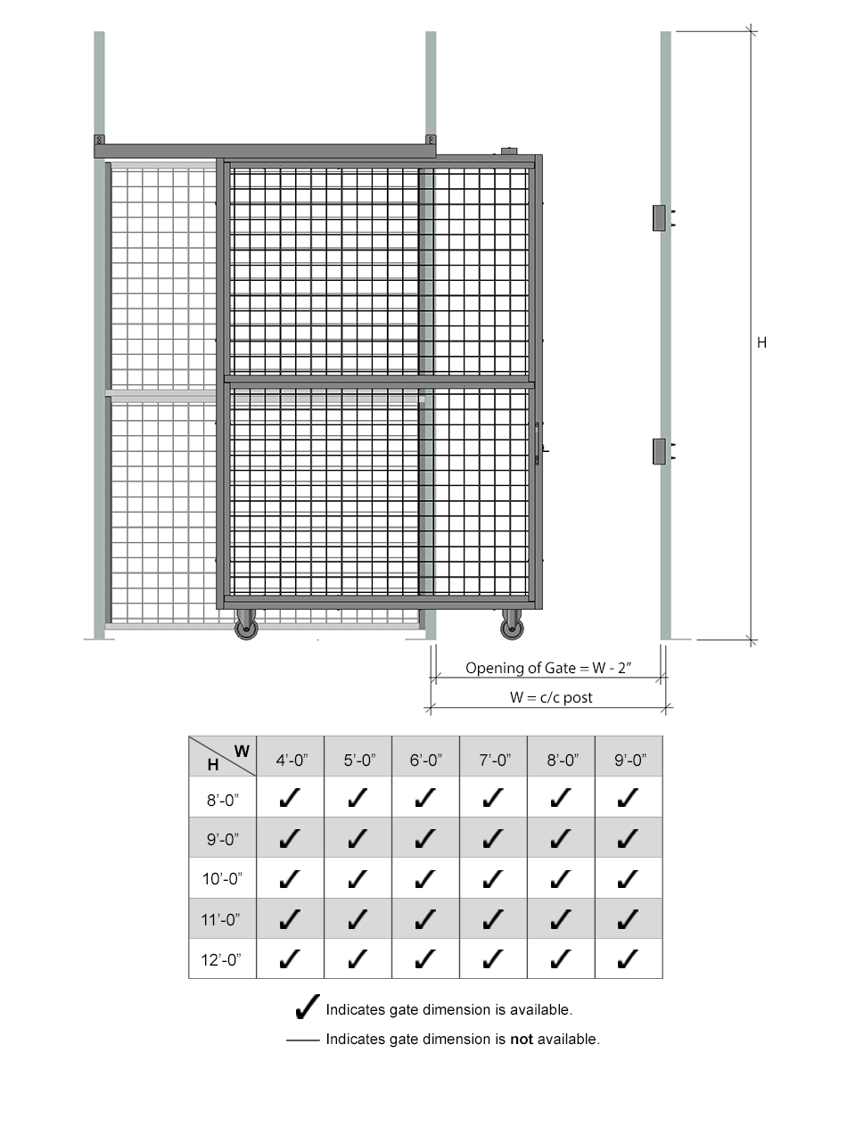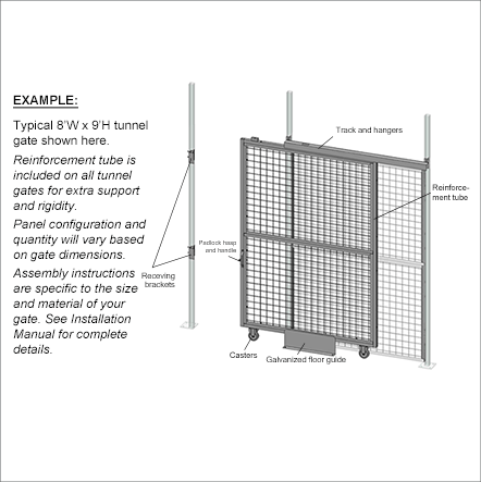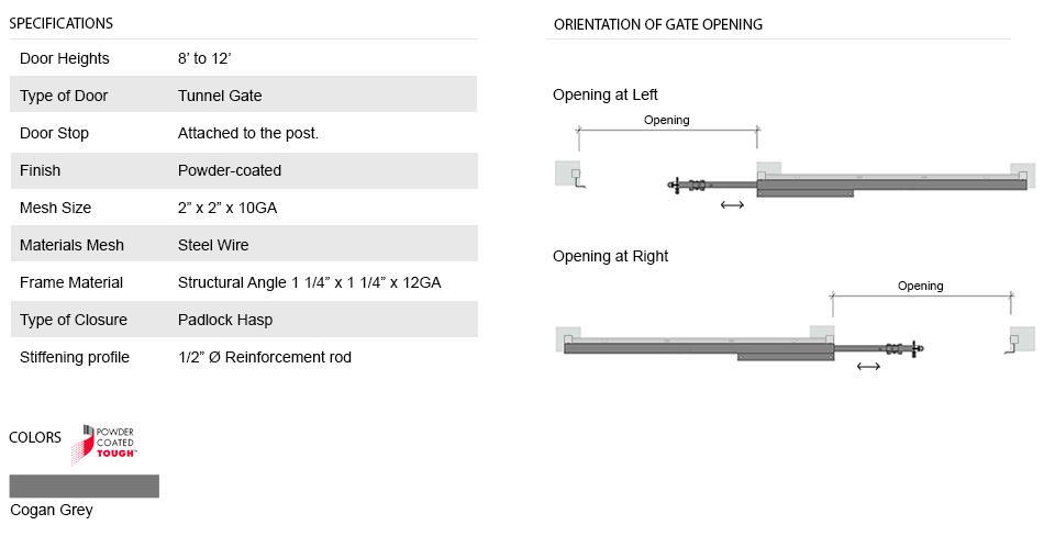 When a wide opening and full height clearance are required for forklift access, nothing works better than a Cogan tunnel gate. All tunnel gates are equipped with a padlock hasp and heavy-duty 5" soft rolling casters. The top track guide allows for easy slide maneuverability, while the strong bolted steel handle offers a sturdy grip. Doors are made of 2" x 2" x 10 GA welded wire mesh framed in 1 1/4" x 1 1/4" x 12GA structural angle with two welded 1/2" ø reinforcement rods.