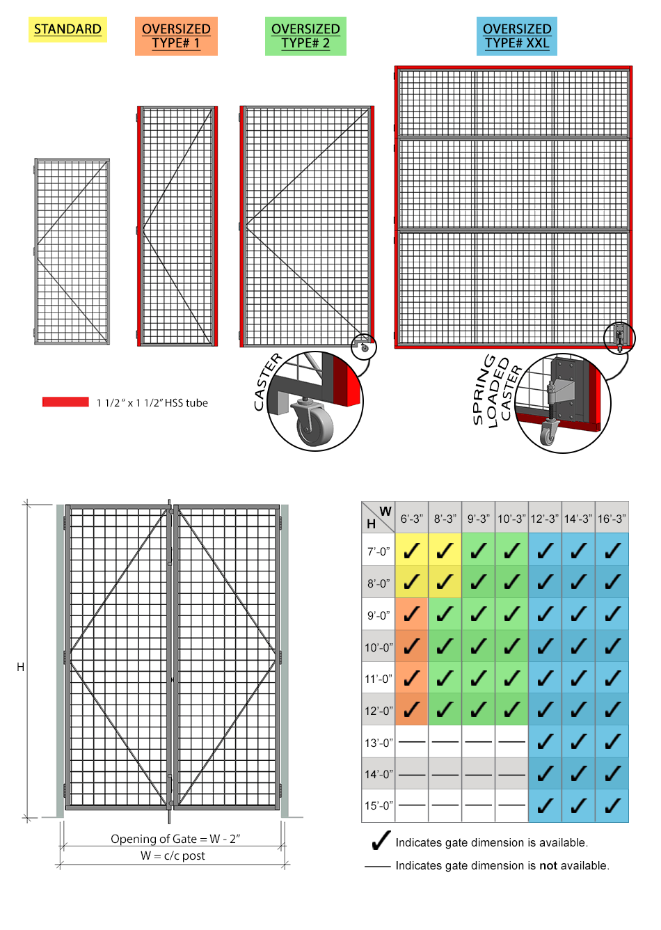 All double swing gates are equipped with a padlock hasp, hinges and door stoppers. Gates can be installed in two different orientations (open inwards or outwards). Additional lock options are also available. Doors are made of 2" x 2" x 10 GA welded wire mesh framed in 1 1/4" x 1 1/4" x 12GA structural angle with two welded 1/2"ø reinforcement rods from center to the corner.