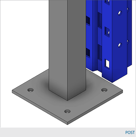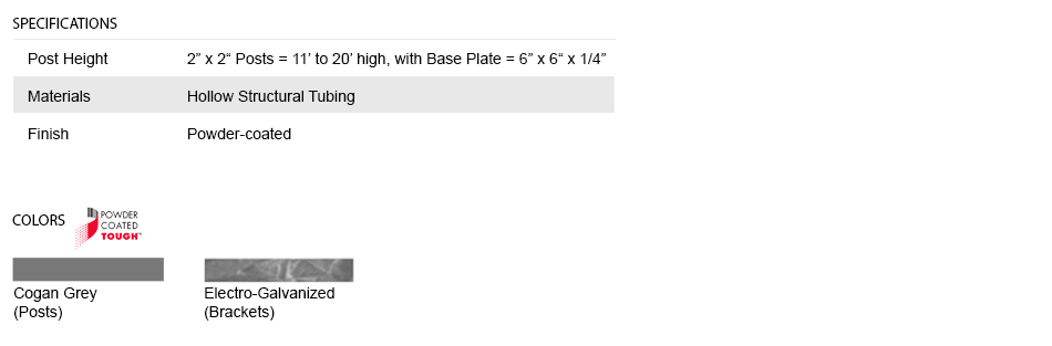 Posts are made of 2" x 2" x 16GA seam welded hollow structural tube. Baseplates are made of 6" x 6" x 1/4" steel plate and punched with four holes for anchor bolts.