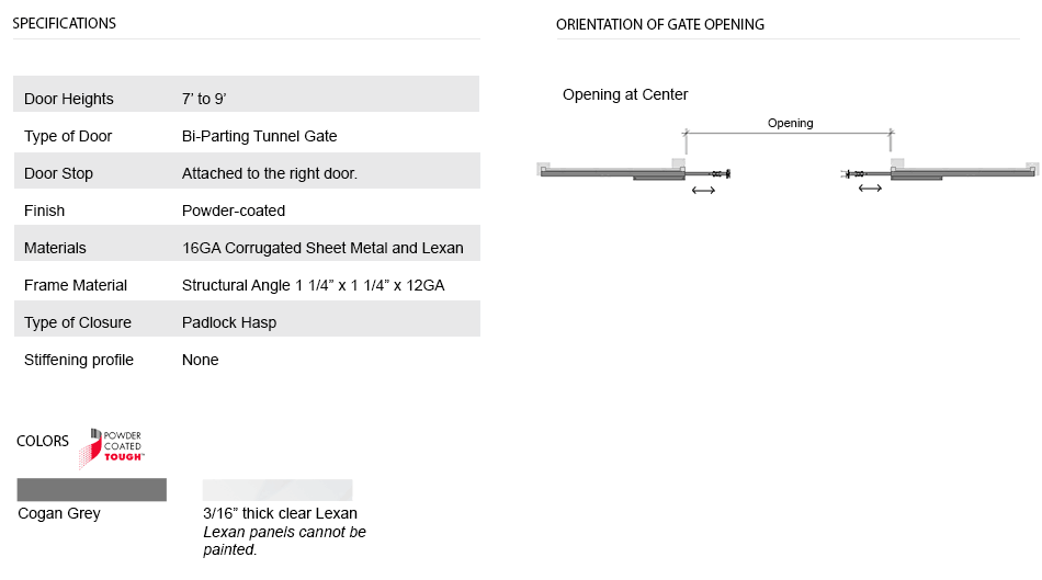 When a wide opening and full height clearance are required for forklift access, nothing works better than a Cogan bi-parting tunnel gate. All bi-parting tunnel gates are equipped with a padlock hasp and heavy-duty 5" soft rolling casters. The top track guide allows for easy slide maneuverability, while the strong bolted steel handles offer a sturdy grip. Doors are made of 3/16" thick clear Lexan and heavy-duty 16 GA corrugated steel framed in 1 1/2" x 1 1/4" x 12 GA structural angle.