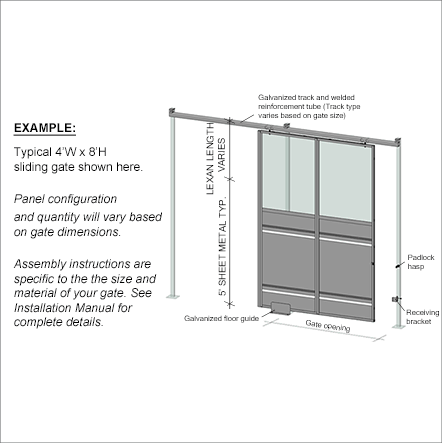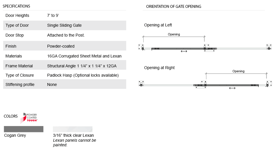 Sliding security gates allow you to have a door opening in constricted areas. With a wide selection of dimensions, sliding gates are ideal for heavy or large equipment and storage access. All sliding gates are equipped with a padlock hasp. Additional lock options are also available. Doors are made of 3/16" thick clear Lexan and heavy-duty 16GA corrugated steel frame 1 1/4" x 1 1/4" x 12GA structural angle.