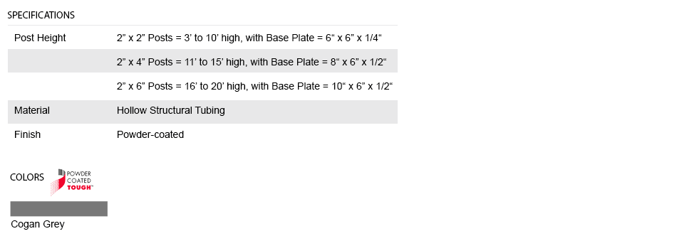 This partition system features freestanding posts up to 20' high. Standard post spacing is 2' to 8' center-to-center. Custom post spacing is also available. Ideal for creating a secured perimeter in any manufacturing or warehouse facility.