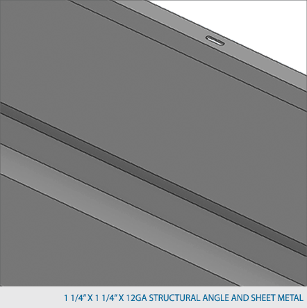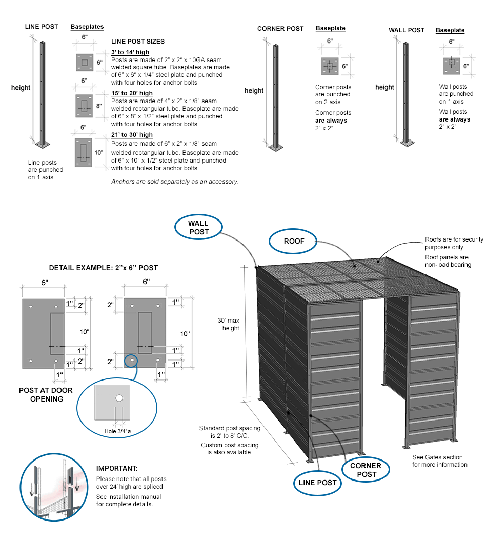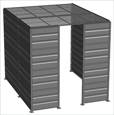 This partition system features freestanding posts up to 30' high and includes framed roof panels for added security. Standard post spacing is 2' to 8' center-to-center. Custom post spacing is also available. The perfect system when you need a high-level security partition in your plant or warehouse. Panels are made of heavy-duty 16GA corrugated steel framed in n 1 1/4" x 1 1/4" x 12GA structural angle. Roof panels are made of 2" x 2" x 10 GA welded wire mesh framed in 1 1/4" x 1 1/4" x 12GA structural angle with two welded ø 1/2" reinforcement rods.