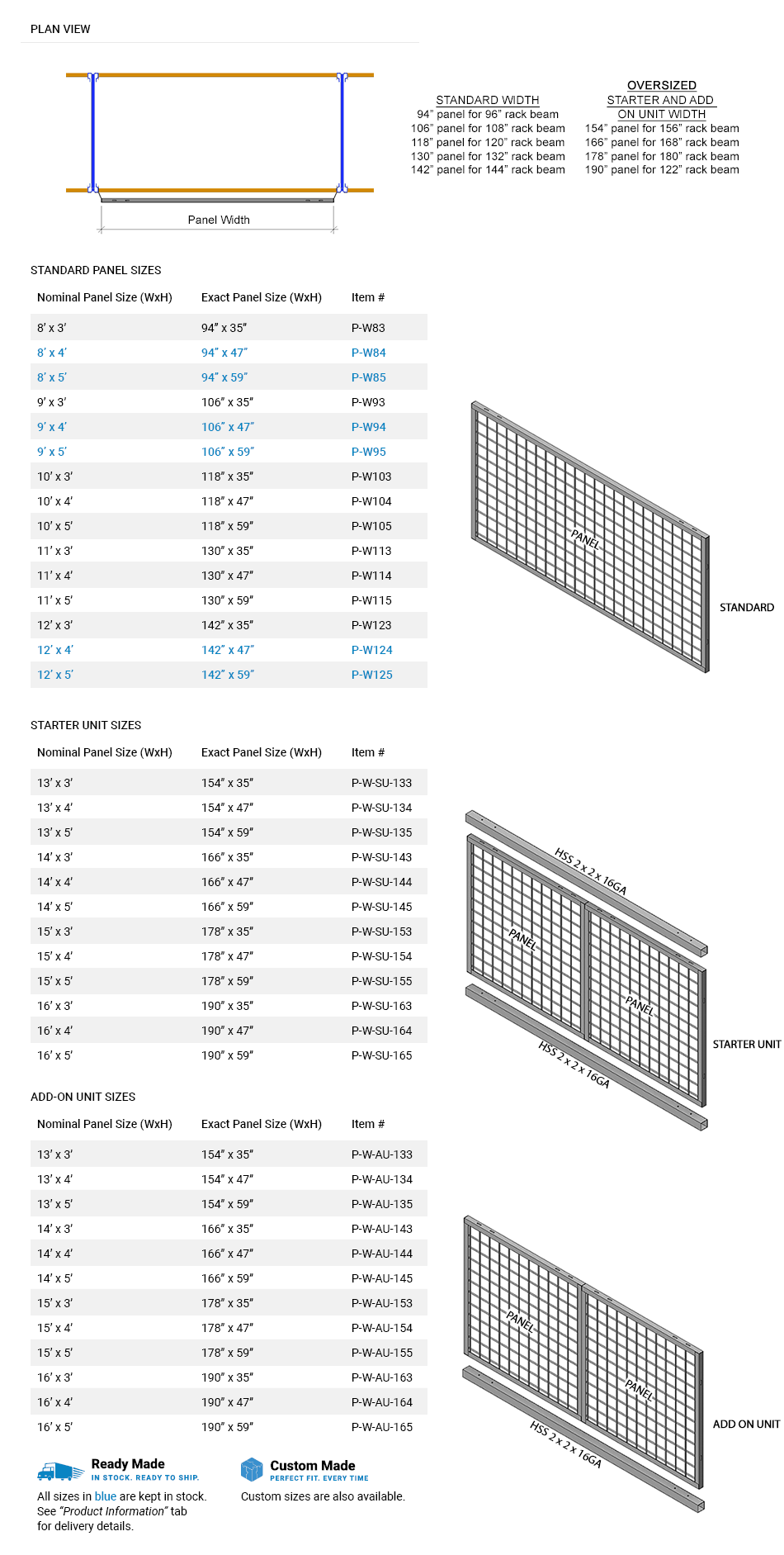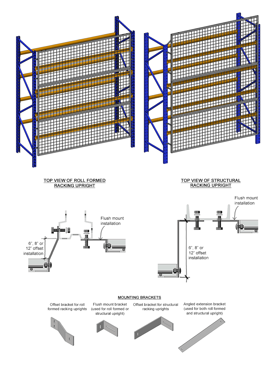 All Cogan wire mesh rack guard panels are made of 2" x 2" x 10GA welded wide mesh framed in 1 1/4" x 1 1/4" x 12GA structural angle. Standard dimensions are kept in-stock.