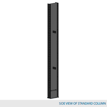 The rack columns are a major component of the cantilever system. They are categorized into two types: LD Columns and HD Columns depending on the width. Rack columns are the vertical structural elements that support the rack arms and roof arms and transfer gravity loads to the rack base and anchoring slab. It is very important to note that the column type is determined by a Cogan engineer based on the quantity of arms and the maximum load capacity per arm. It is essential to refer to the assigned Cogan quote or Cogan Approval Drawings for detailed column and storing material.
