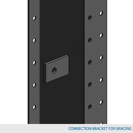 Rack columns are manufactured of structural W-sections and shall have a shop-welded base plate. In order to provide lateral stability along the length of the system, the columns are held together with horizontal braces and cross braces. The braces are bolted to the columns with ASTM A325 structural bolts. The braces are made of structural steel either in the form of a plate or an L-shape. For outdoor applications, the effects of climatic loads that may be exerted directly to the column or transferred from the rack arms, roof arms and any siding, cladding or other enclosure material are carefully factored in to the column design. The column may be assembled in a single- or double-sided configuration. The bracing configuration is very important to the structural integrity of the column assembly. When bracing a 12'H run, the first and last bay must always be secured with a cross brace and a horizontal brace, even if the second-to-last bay is secured with the same. For a 16'H run, the first and last bay must always be secured with a double cross brace configuration. For all inside bays, alternate between a quadruple horizontal brace and a double cross brace.