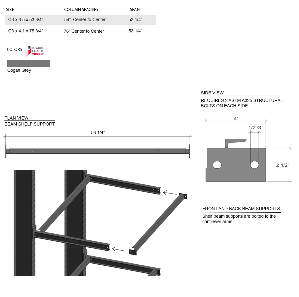 Cantilever racking can also be used for shelving applications. With the installation of beam supports, the racking can be modified and made into a shelving system. Beam supports provide additional reinforcement for heavy or unevenly distributed loads. Wire mesh shelf overlays are fastened on top of the beam supports to create a smooth surface for the storage of smaller items.