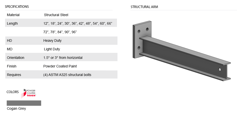 Structural arms are available in various lengths, which include 12", 18", 24", 30", 36", 42", 48", 54", 60", 72", 78", 84", 90", and 96". The arm plate connection is identified as 3"MD, 4" MD, 4"HD, 5" HD, 5.5" HD, and 6" XHD, which indicates the spacing between each punched bolt hole. The plates are either 1\2" thick or 5\8" thick and have four ø13/16" or ø 1/2" punched holes at each corner. The plate requires 4-ASTM A325 structural bolts specified and tested for this specific purpose. These bolted connections fix the arm to the rack column on one end, leaving it free on the opposing end, thus resulting in a cantilever rack arm. The arms are designed to resist uniformly distributed loads exerted by the product that is supported and shall be manufactured of structural S-sections, W-sections or equivalent structural profiles. The supported load should be centered on the arm and should refrain from exceeding the edge of the arm. The arms are used for interior and exterior purposes. For all applications, the arms are finished with a powder-coated Cogan standard grey paint, which provides ultra-resilient protection.