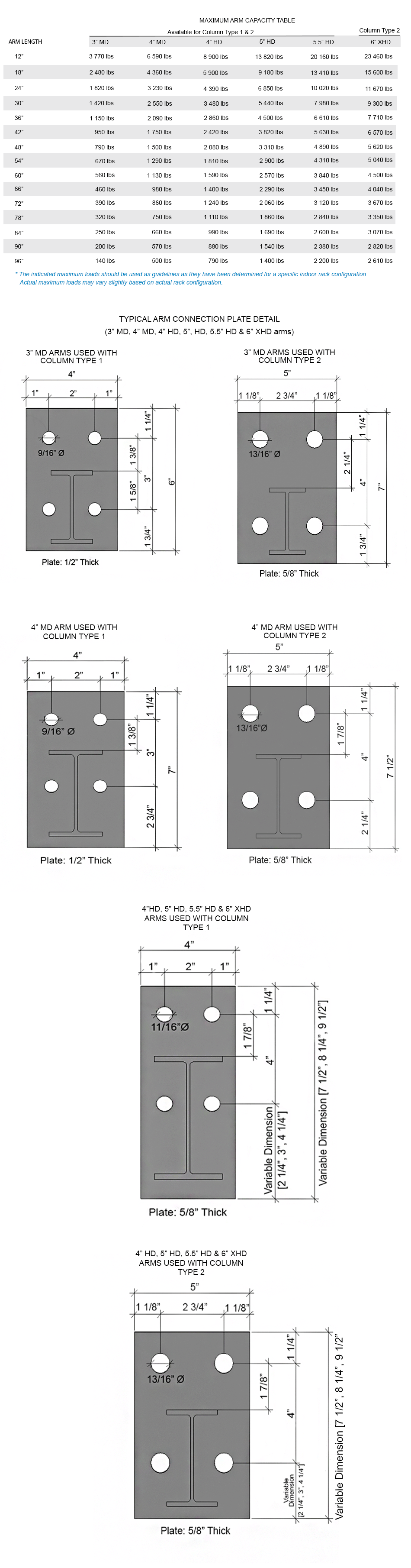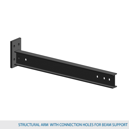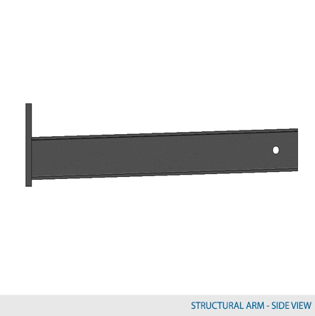 Structural arms are available for any required purpose. It is composed of a beam welded to a plate connection and are manufactured angled at an incline of 1.5° or 3° from the horizontal. The number of arms required for a specified column is determined by the client. This will affect the overall design of the cantilever racking system. The arms are classified as either MD or HD which indicates the load bearing capabilities of the arms. MD implies light duty and HD means heavy duty. When configuring the number of arms required per column it is important to take into consideration two factors; the maximum capacity per column and the maximum capacity per arm. The total combined weight capacity of the arm should not exceed the maximum capacity of each column.