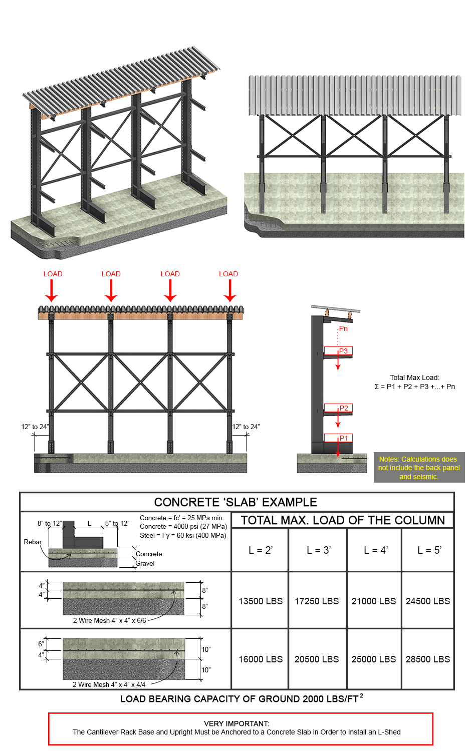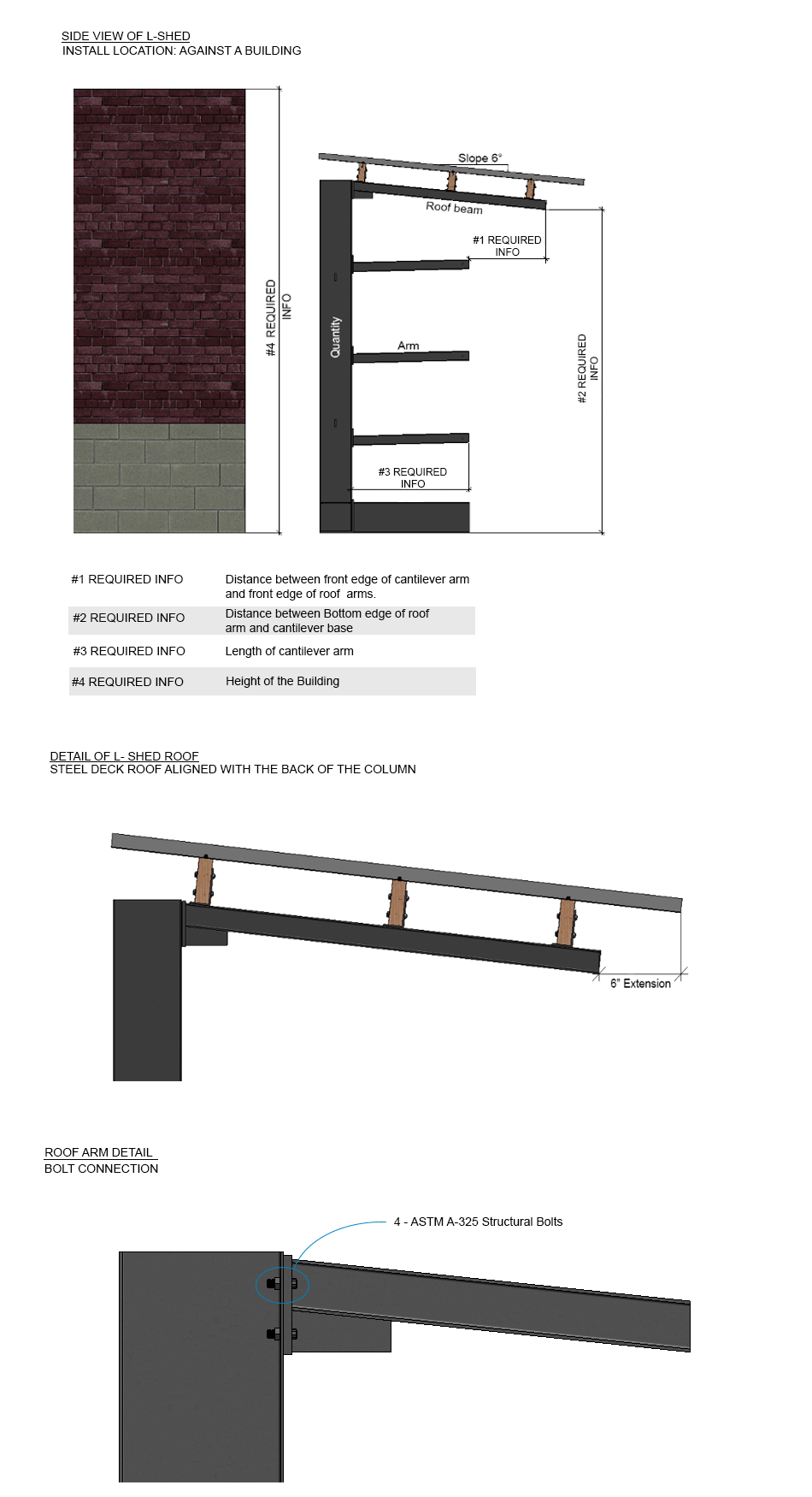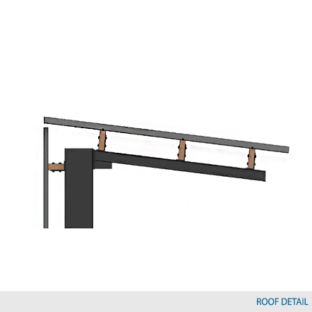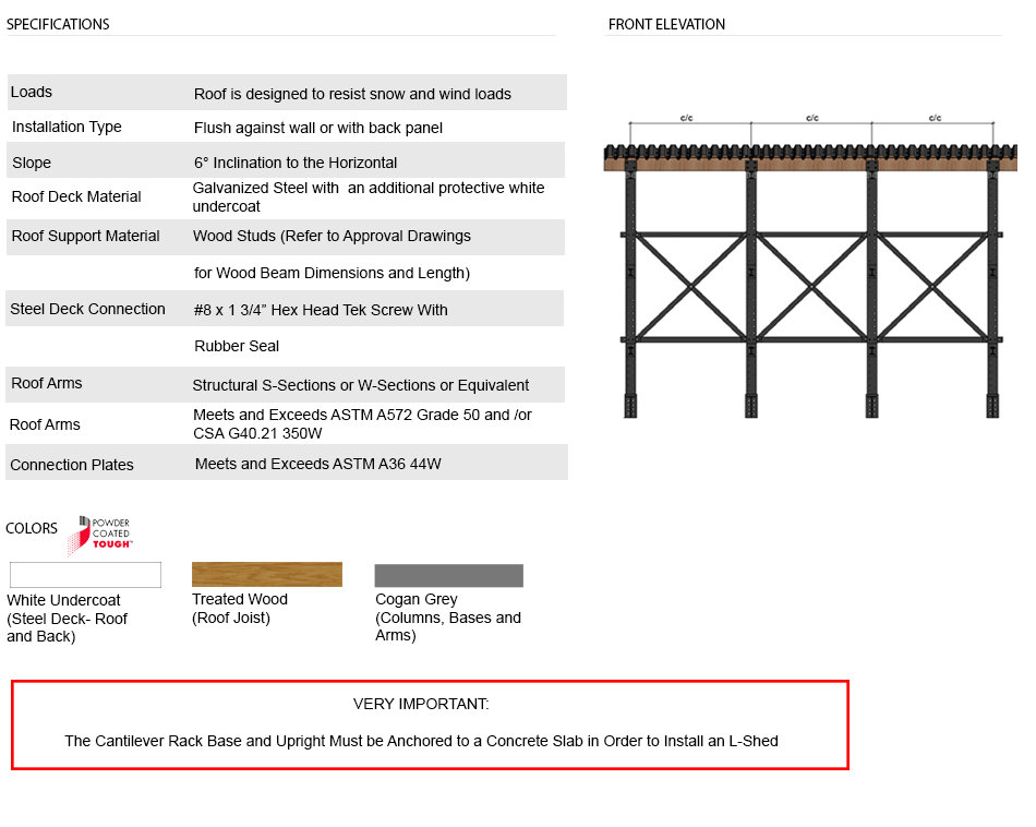 The roof deck is made of galvanized steel which is screwed onto each wood beam with waterproof #8" x 1 ¾" hex head tek screw with a rubber seal. Each roof panel must overlap the previous one and must be screwed in accordingly. The L-Shed roof may be placed flush against a wall or can have the roof steel deck extend 6" but only if back panels are installed. The back panels are supported by 2"x 4" wood beams. The shed must extrude 6" from the edge of the rack arms for the L-shed.