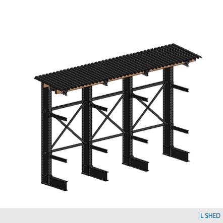 The shed system is an effective way of utilizing outdoor space while carefully storing material goods in a safe and efficient way. A steel deck roof provides adequate protection against snow, ice, rain and sun damage. The roof angle design allows rain to flow down easily and shields against harsh weather conditions. The system, including the column, roof arms, and rack arms, is painted Cogan. In order to account for local weather variances, Cogan cantilever roofs are always custom-manufactured for the specific system. The shed is available as an L-Shed or a T-shed. The L-Shed can be set up as a standalone single-sided column with the installation of back panels or set up flush against a wall. The T shed is a double-sided column with the roof extruding on both sides. The T-Shed is optimal for lumberyards. It allows for the easy storage of wood beams, plywood and any type of building materials. Items are clearly sorted and kept off the ground for fast access and inventory control. Protection from the elements means material will not warp or deteriorate from harsh weather conditions.