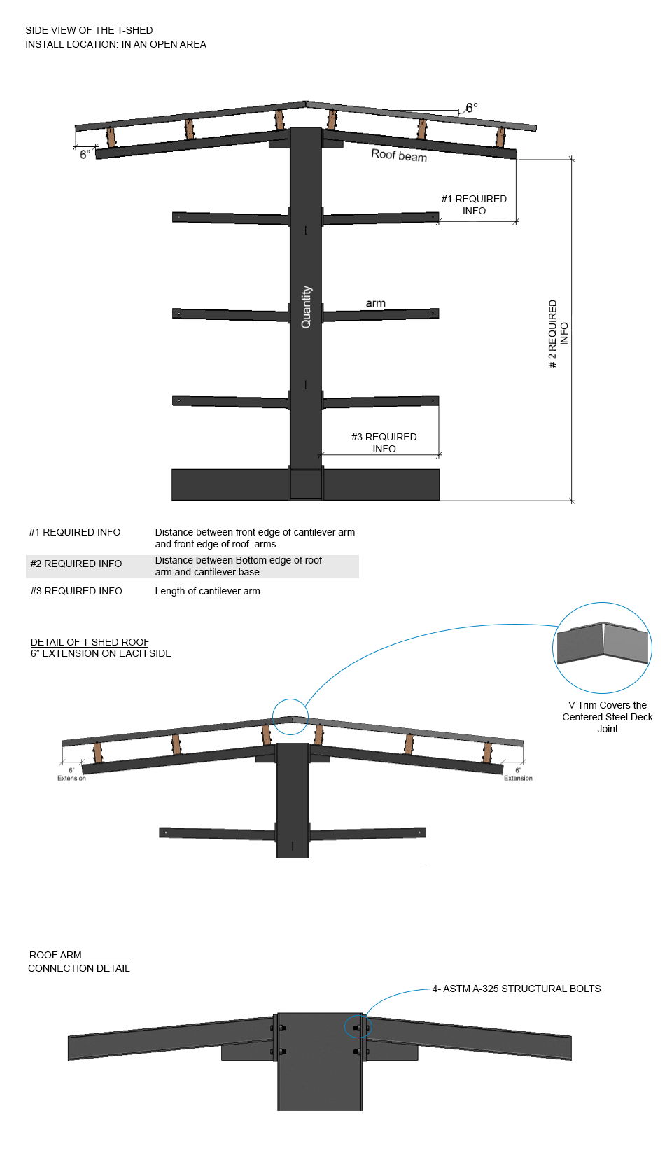 The roof deck is made of galvanized steel which is screwed onto each wood beam with waterproof #8" x 1 ¾" hex head tek screw with a rubber seal. Each roof panel must overlap the previous one and must be screwed in accordingly. The shed must extend 6" from the edge of the rack arms for the T-shed.