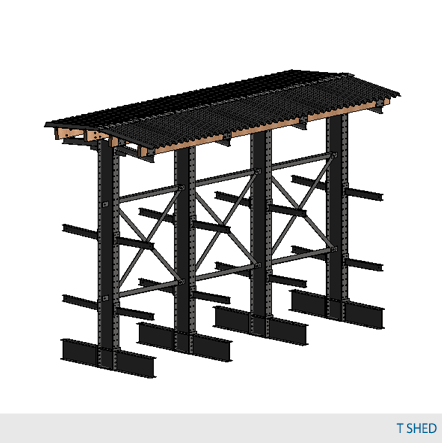 The shed system is an effective way of utilizing outdoor space while carefully storing material goods in a safe and efficient way. A steel deck roof provides adequate protection against snow, ice, rain and sun damage. The roof angle design allows rain to flow down easily and shields against harsh weather conditions. The system, including the column, roof arms, and rack arms, is painted Cogan. In order to account for local weather variances, Cogan cantilever roofs are always custom-manufactured for the specific system. The shed is available as an L-Shed or a T-shed. The L-Shed can be set up as a standalone single-sided column with the installation of back panels or set up flush against a wall. The T shed is a double-sided column with the roof extruding on both sides. The T-Shed is optimal for lumberyards. It allows for the easy storage of wood beams, plywood and any type of building materials. Items are clearly sorted and kept off the ground for fast access and inventory control. Protection from the elements means material will not warp or deteriorate from harsh weather conditions.