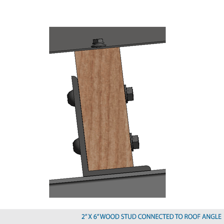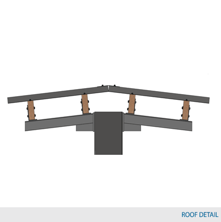 The roof top angle which is used for T-sheds is a thin metal flashing which provides a protective seal between the cantilever columns. The angle must overlap when using more than one length. It should be screwed every 24" with a tek screw. The roof is supported by 2" x 6" wood beams with varying length. When using continuous wood beam, the beam must be attached by bolting it diagonally. When joining 2 wood beams on the same bracket, center them in the bracket and bolt it twice. Align steel deck centered on the column.