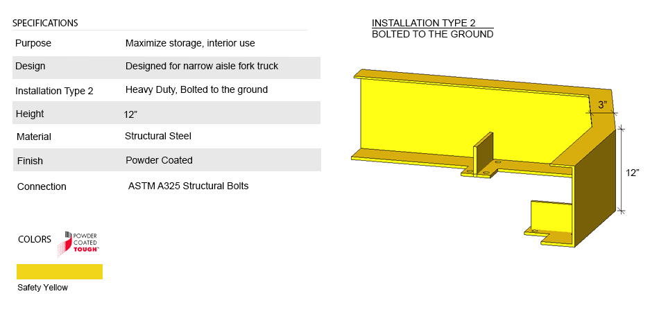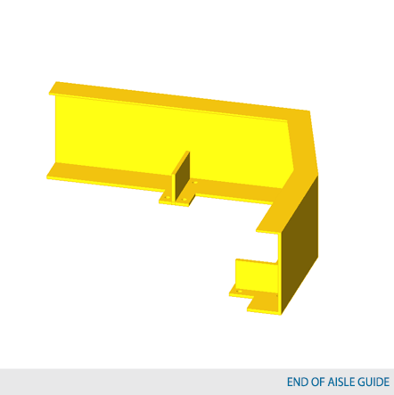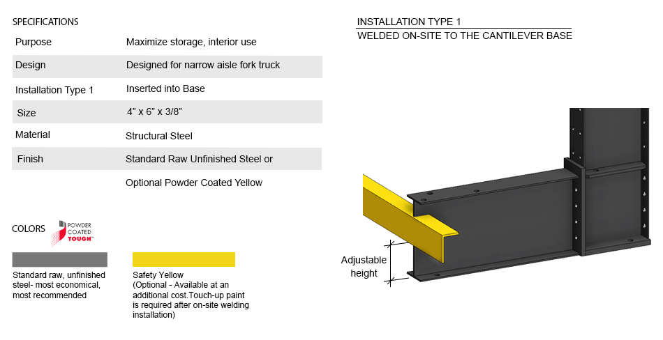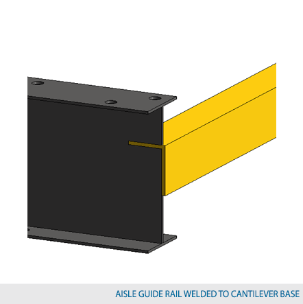 The guide rail is divided into two categories: installation type 1 and installation type 2. When installing type 1, the guide rail is welded to the cantilever rack base on site. Heavy-duty end-of-aisle guardrail is placed at each corner of the assembled cantilever system. Angles are then welded to the end-of-aisle guardrail, which creates a continuous barrier around the assembled system. Guide rails measure 4"x 6" x 3/8". End-of-aisle guardrail is 12"H and features a 3" fold along the top of the rail.