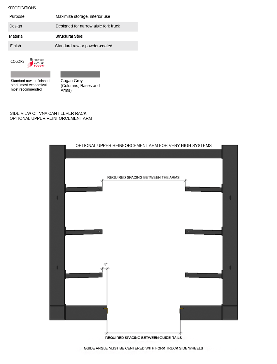 VNA cantilever racking offers the same versatile storage abilities as conventional cantilever racking, but with added aisle guide rail and end-of aisle guardrail. The rails work to guide narrow aisle fork trucks through the picking aisles, allowing for faster, easier and more efficient operation. Pick precision is increased and material damage is significantly reduced.